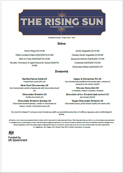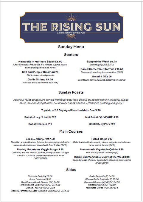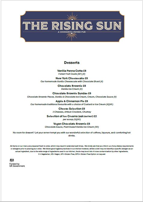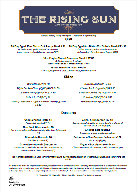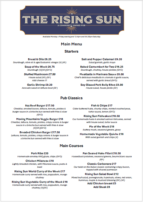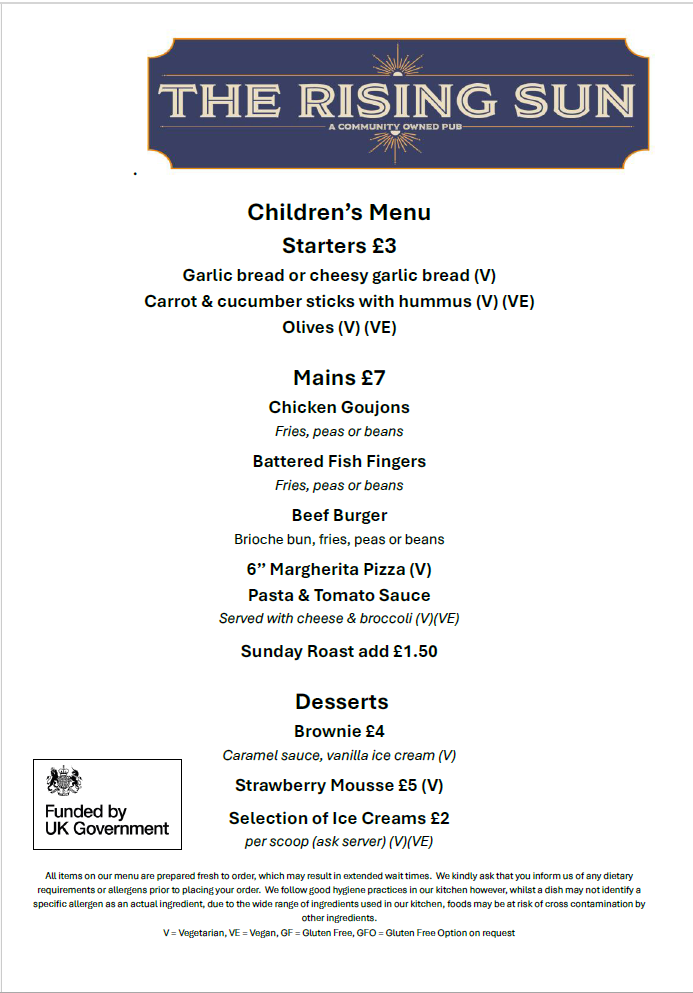 Our delicious Evening and All Day Saturday Menu but don’t forget we have a specials board as well in the pub. Looking for a Sunday lunch then look no further than our fabulous Sunday Menu Our weekday lunch menu Yum-yum, it’s our Children’s menu A great selection of wines are available in our Wine List Fancy something special try our Cocktail Menu 5 Star Food Hygiene Rated